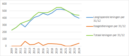In 2024 is alleen gebruik gemaakt van korte financiering middels kasgeldleningen, waarmee ook de afgeloste langlopende leningen zijn geherfinancierd. Gemiddeld over het jaar was de hoogte van de kasgeldleningen € 30 miljoen.